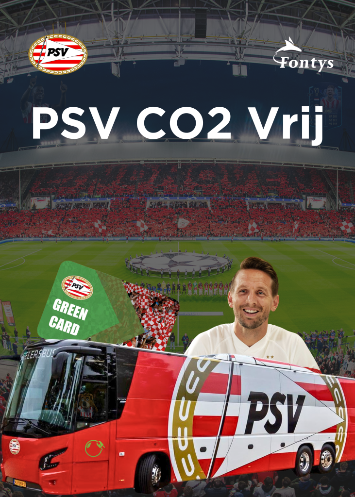De poster die je ziet heb ik zelf ontworpen in Canva, om het bekend over te laten komen voor de mensen hebben we veel elementen van PSV erin terug laten komen, zoals de spelersbus, Luuk de Jong, het stadion, het logo en ons zelf gemaakte greencard.