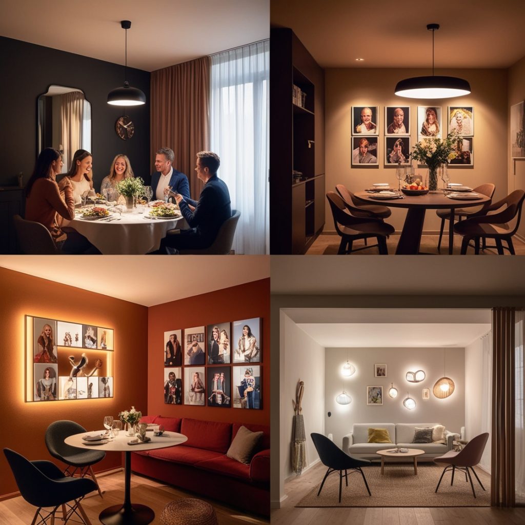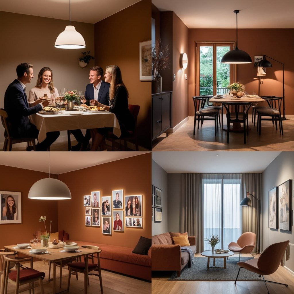Prompt:Een visueel aantrekkelijke scène van een warm en sfeervol interieur dat laat zien hoe INNR-verlichting de perfecte setting creëert voor verschillende momenten. Denk aan een gezellige eetkamer tijdens een romantisch diner, waar zachte verlichting de tafel subtiel omhult en de sfeer intiem en persoonlijk maakt. In een aangrenzende woonkamer straalt de slimme verlichting een rustgevende gloed uit, ideaal voor een ontspannen avond met een boek of een serie. De foto benadrukt de veelzijdigheid van INNR-verlichting, met dynamische lichtscènes die moeiteloos schakelen tussen helder functioneel licht en warme, uitnodigende tinten. In een hoek is een kleine galerij van foto’s zichtbaar waarin echte klanten hun stijl delen, om het gevoel van sociale verbondenheid te versterken. De ruimte straalt luxe en toegankelijkheid uit, met een combinatie van moderne en tijdloze elementen, perfect afgestemd op een huis dat leeft en ademt sfeer. zet er geen mensen.