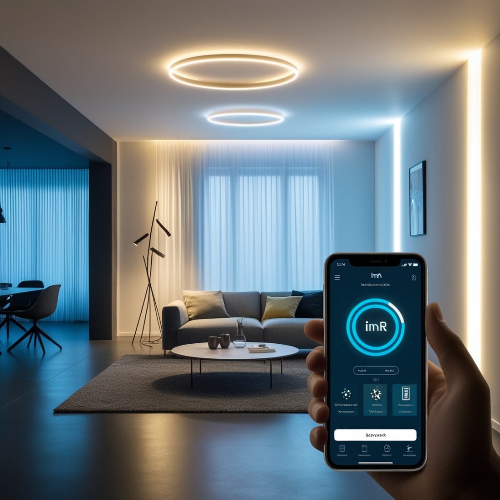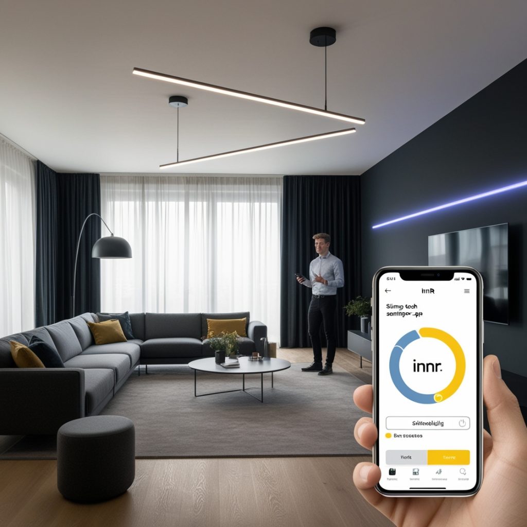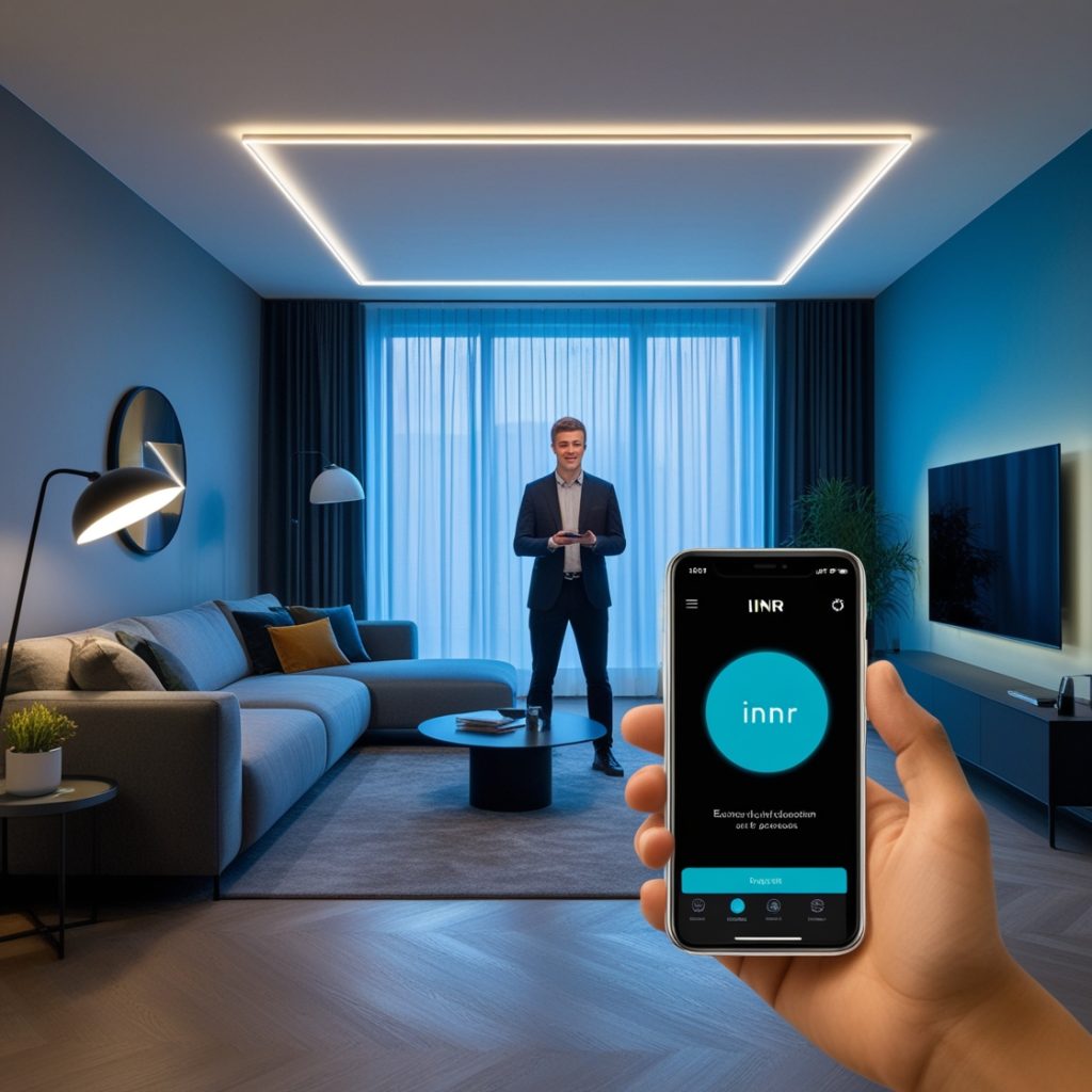 Prompt: Een futuristische, moderne woonkamer met slimme INNR-verlichting die technologie en stijl perfect combineert. Denk aan een strak interieur met een minimalistisch design, waar slimme lampen subtiele maar opvallende kleuraccenten creëren in de ruimte. In de scène toont een jong, tech-savvy persoon via een smartphone-app hoe eenvoudig het is om de lichtscènes aan te passen. Het scherm van de smartphone is duidelijk zichtbaar en toont de gebruiksvriendelijke interface van INNR.