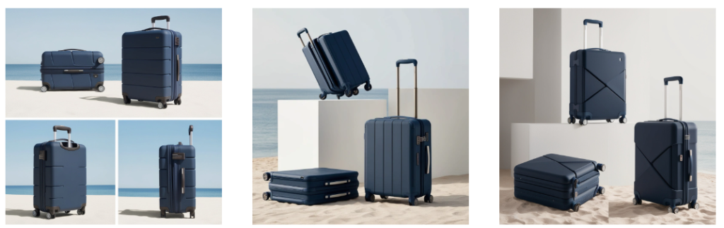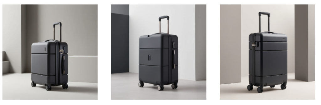Ik was nog niet helemaal tevreden met het resultaat omdat ik de koffers niet echt plat vond, ook vond ik de kleur niet helemaal passend bij wat we zochten, daarom heb ik het prompt verandert naar het prompt: Create an image of a modern, sleek foldable suitcase in a minimalistic setting. The suitcase should have a durable yet lightweight design, with smooth, collapsible panels made of high-quality materials like polycarbonate. The suitcase is shown half-folded to display its space-saving function, with sturdy wheels and a retractable handle visible. The color palette is neutral, with options like matte black, grey, or navy. Highlight details such as a built-in TSA lock, compact dimensions when folded, and a smooth texture that emphasizes durability and convenience for travel. Daar kwam dit uit: