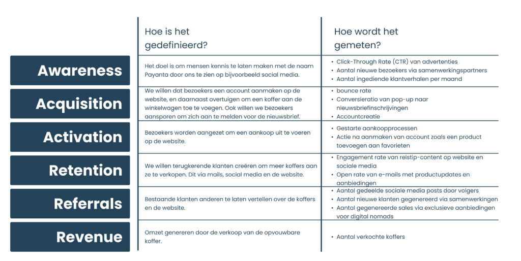 Voor ons eerste project hebben we gebruik gemaakt van de Pirate Funnel om onze groeistrategie te bepalen. Deze methode, die zich richt op de zes kernfasen van de klantreis (Awareness, Acquisition, Activation, Retention, Revenue en Referral), hielp ons om duidelijk inzicht te krijgen in welke stappen cruciaal zijn voor het aantrekken en behouden van klanten.