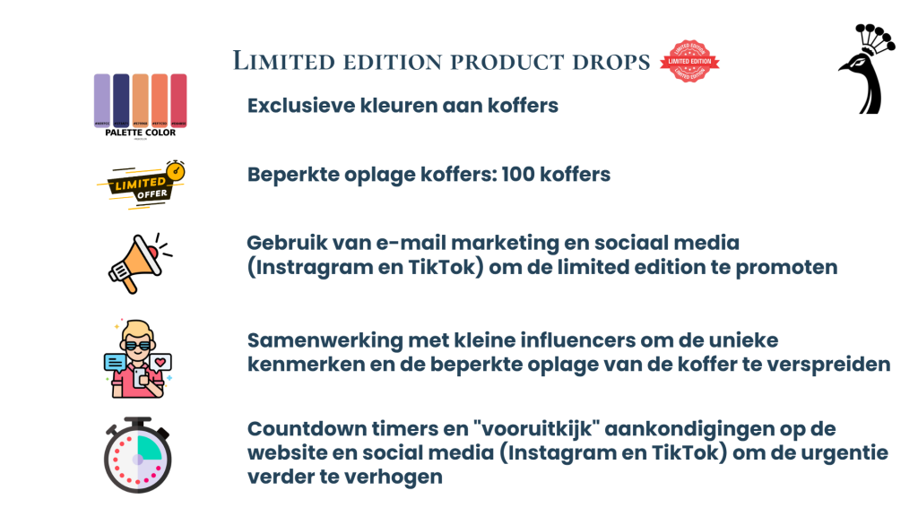 Om meer bekendheid te krijgen had ik ook een limited edition product drops bedacht. De uitleg is hieronder in de afbeelding te zien, deze is afkomstig van de eindpresentatie.