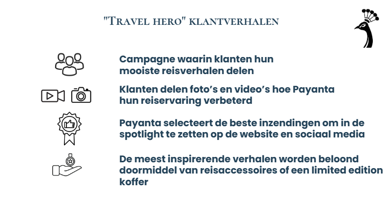 KPI: Aantal ingediende klantverhalen per maand, met als doel minimaal 20 klantverhalen per maand te ontvangen waarin de Payanta-koffer centraal staat om sociale bewijsvoering te vergroten (Kupers, Tui, Corendon, -reizen).