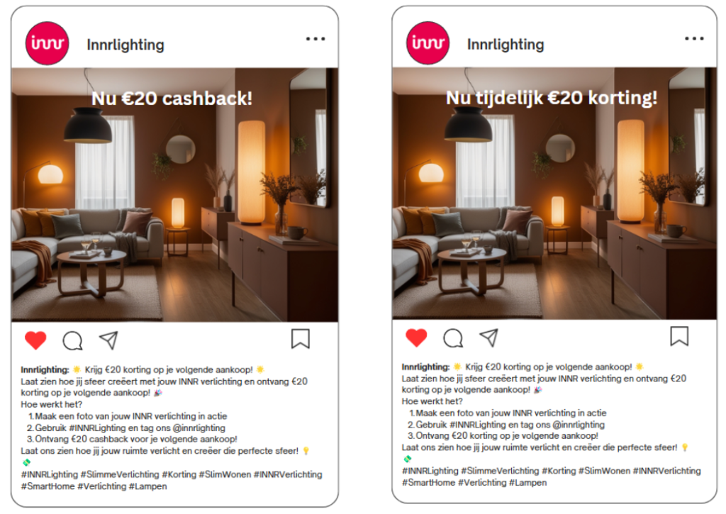 Voor de aankoopfase heb ik 4 verschillende posts gemaakt 2 voor elke doelgroep, de post voor de techsavvys bevat een gamekamer met een kortings actie en een met een cashback actie. De post voor de mensen die de INNR verlichting voor sfeer kiezen hebben ook een kortings en cashback post.