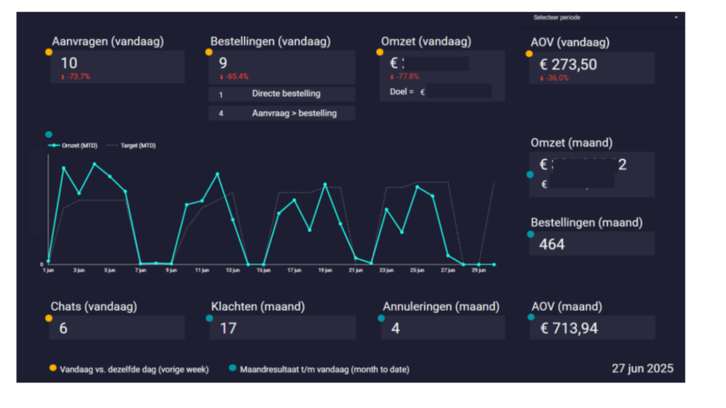 Dan hebben we de kopjes Omzet (vandaag). Dat is gewoon wat we vandaag aan omzet hebben gedraaid. De exacte bedragen heb ik nu even geblurred, maar in de live versie zie je hier gewoon de actuele cijfers. Het kopje AOV staat voor Average Order Value, oftewel: hoeveel er gemiddeld per bestelling is uitgegeven op die dag.